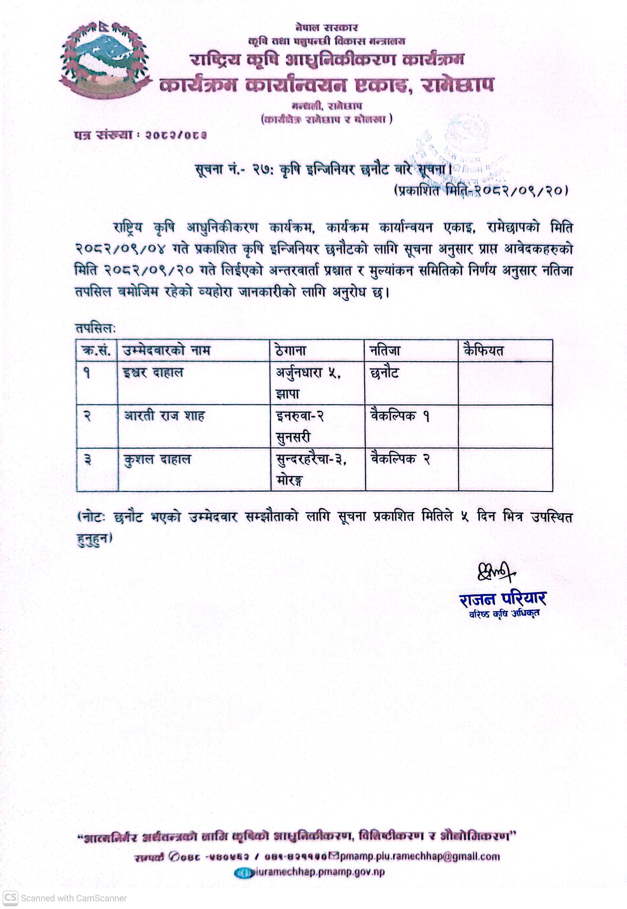 सूचना न २७: कृषि इन्जिनियर छ्नौट सम्बन्धि सूचना